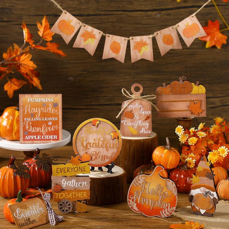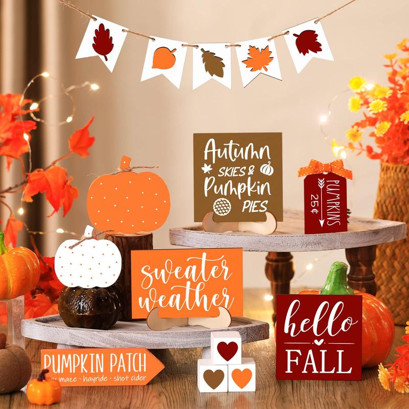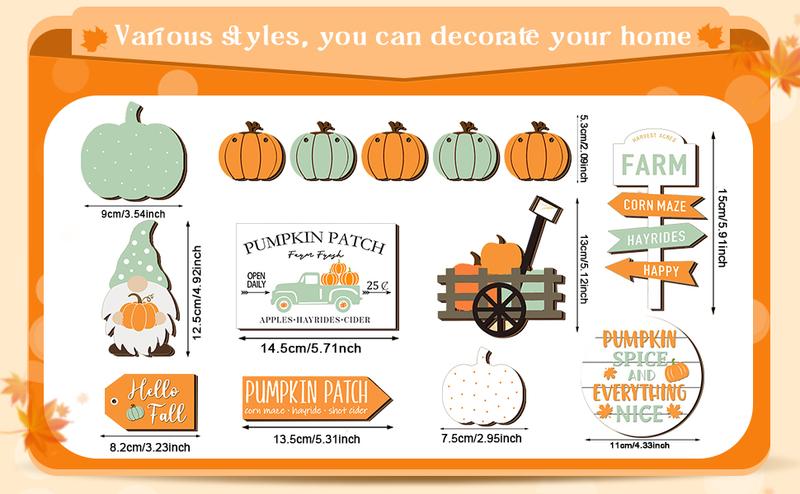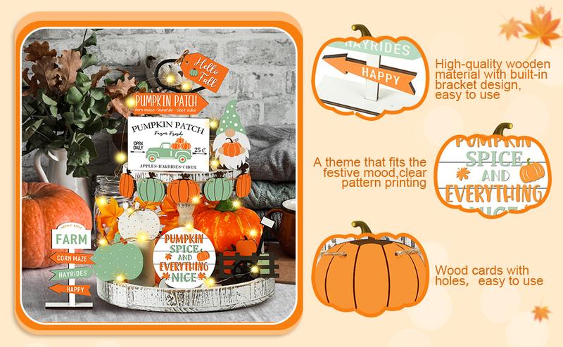 1.Fall Tiered Tray Decorations Set: you will receive 13 pieces of fall tiered tray decorations, including 7 pieces of freestanding fall decorations and 6 pieces of pumpkin and maple leaf shaped decorations that can be strung on the rope provided to form a banner, and there are some adhesive dots, sufficient quantity can meet your home or party tiered tray decor needs, and you can share with others
